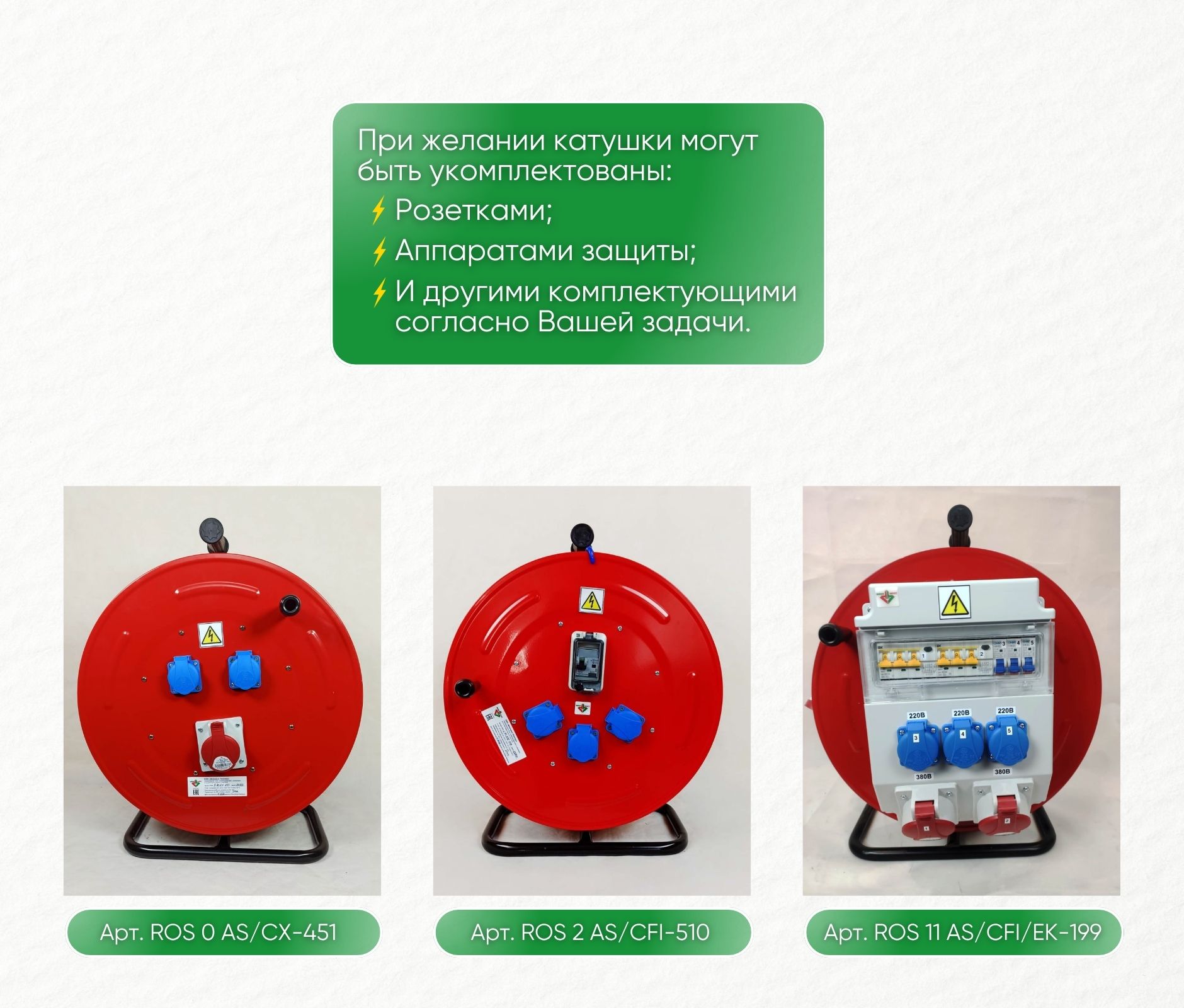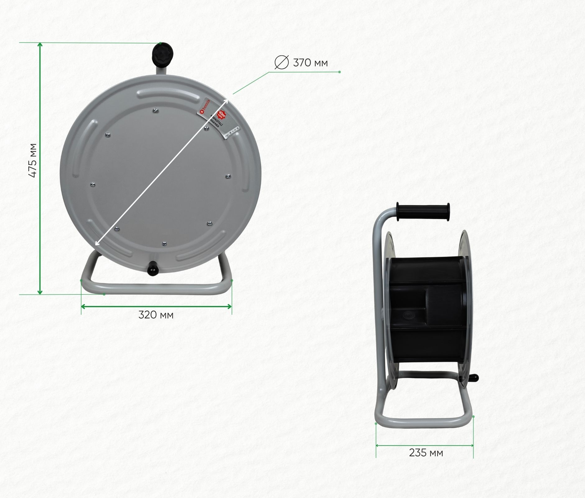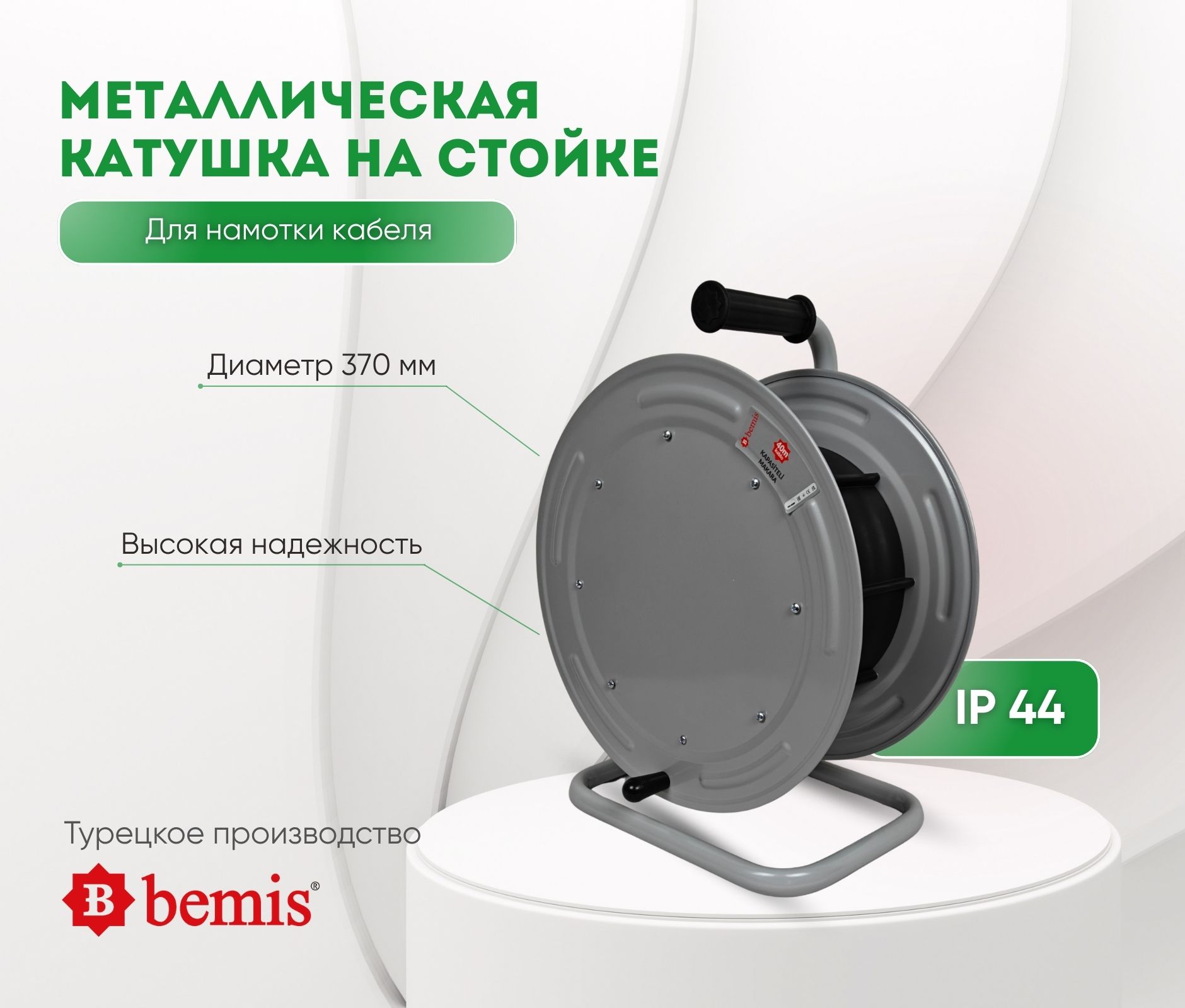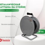 Катушка переносная BM4-5000-0000 металлическая, диаметр 370 мм, без розеток, на металлической стойке, IP44. В комплекте без кабеля, максимальная установочная длина 40 м, при сечении 5×2,5 мм