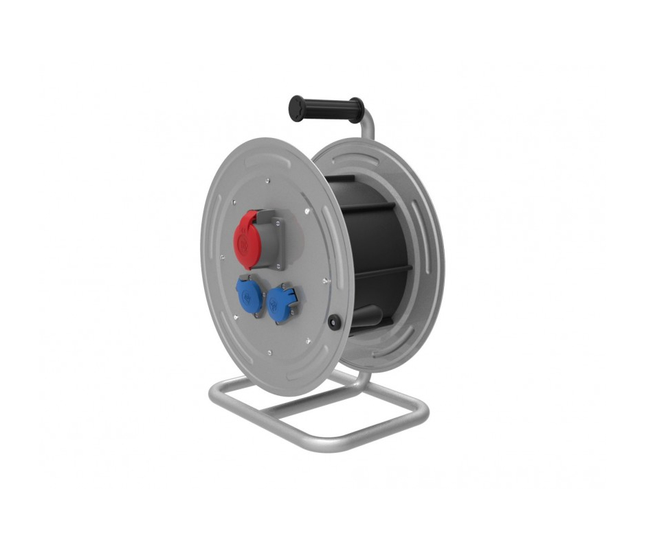 Катушка переносная BM4-5203-1060 металлическая, диаметр 370 мм, с розетками 1/16A (2P+E, 220V)*2, 3/25A (3P+E, 380V-450V)*1 на металлической стойке, IP44. В комплекте без кабеля, максимальная установочная длина 40 м, при сечении 5×2,5 мм