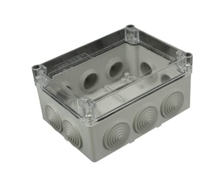 Распределительная коробка KV 1609 с прозрачной крышкой. Габаритные размеры корпуса 200х238х111 (ШxВxГ). Материал полистирол, цвет серый, IP54. Крышка имеет возможность опломбировки.