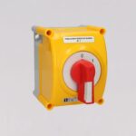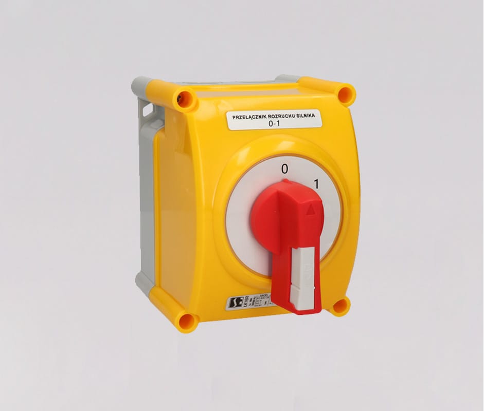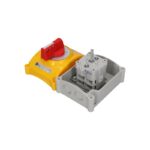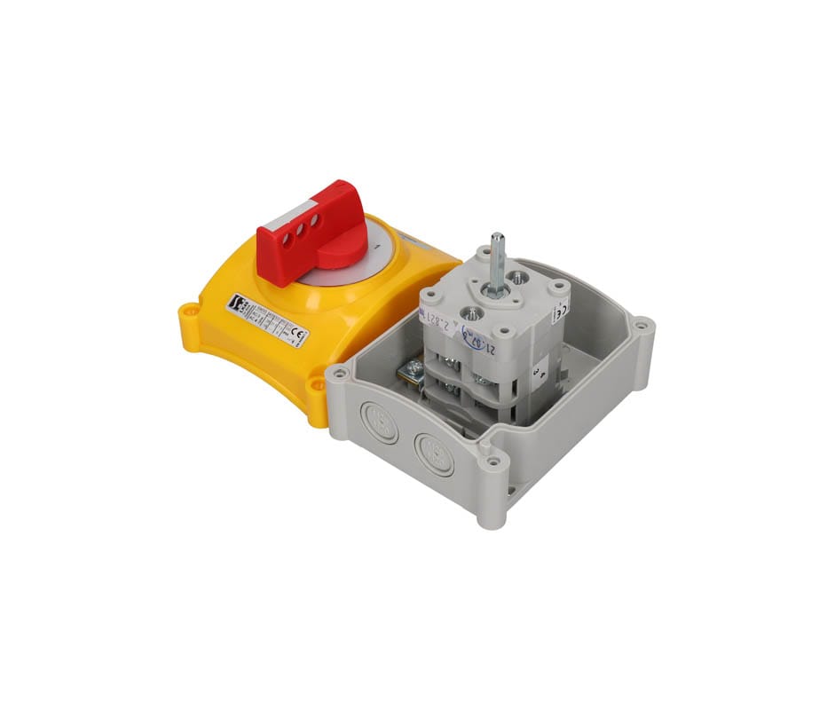 Выключатель LK16R-2.8210\OB2ZC схема 0-1, 4-полюсный, 16А, в корпусе, IP65, жёлто-красная ручка, с запираемым фасадом