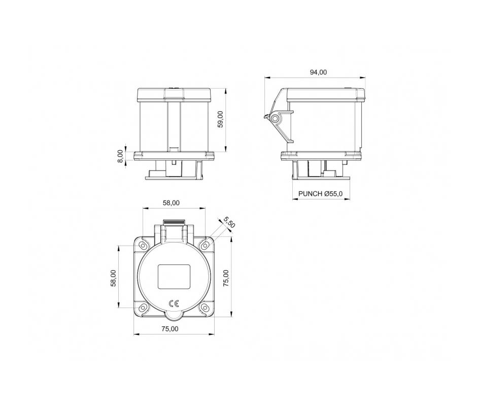 Розетка BC1-3403-2413 встраиваемая 32A, 3P(2P+PE, 220V-250V), IP44
