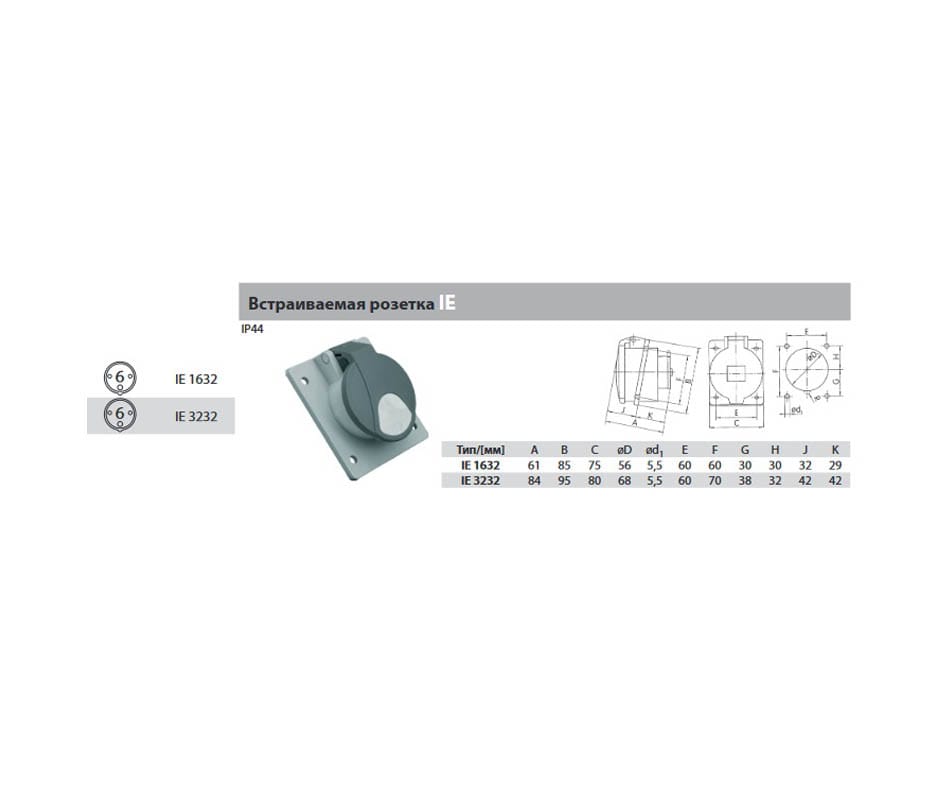 Розетка IE 1632 , встраиваемая, 16A, 3P(2P+PE, 220В), IP54