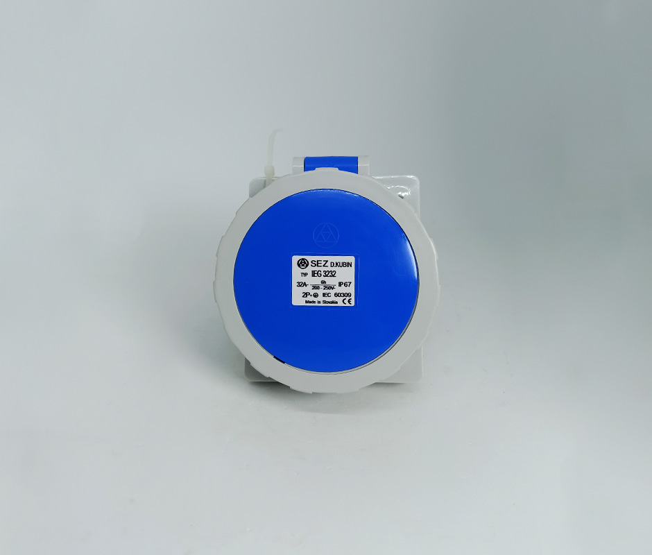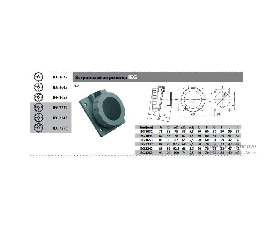 Розетка IEG 3232 (M) встраиваемая, 32A, 3P(2P+PE, 220В), IP67 с монтажным комплектом (крепежная рамка ND 105-2177 + 4 винта SKRUTKA KAL 4,0×20)