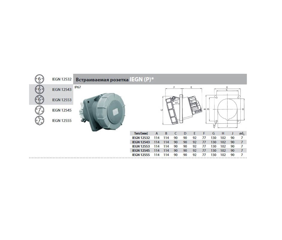 Розетка IEGN 12553 встраиваемая, 125А, 5P(3P+N+PE, 380В/400В), IP67