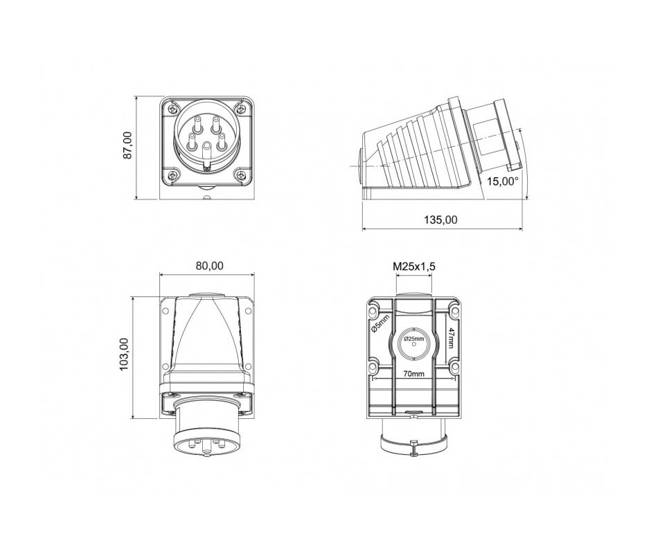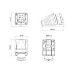 Вилка BC1-1505-2236 настенная 16А, 5P(3P+PE+N, 380V-450V), IP44. Угол наклона 90 градусов